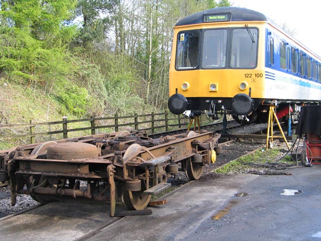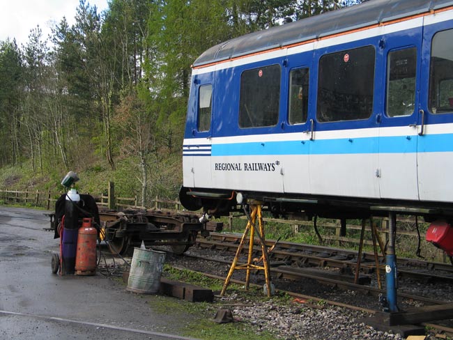 22/4/05, W55000, the line's bubble car is owned by one of our members and is under long term restoration. It had a major step forward this week as it's newly turned wheels were fitted. |