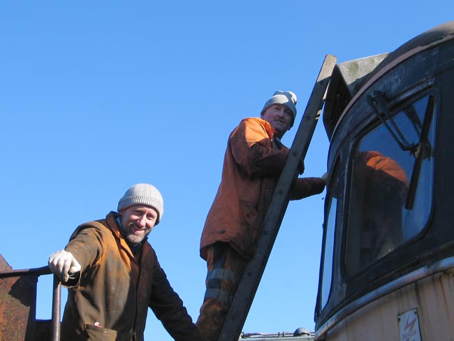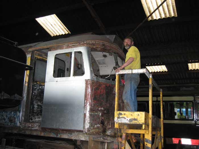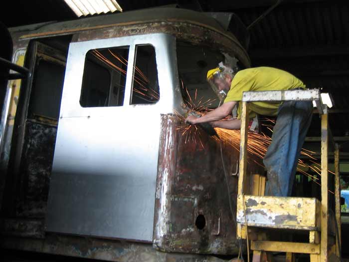 33 002 BODYWORK REBUILD BEGINS! July 05-The long and arduous task of sorting out 33002's cabs has started. The main body is not to bad but the cabs are a real mess after years of being bodged up with fibreglass by BR. The Sunday gang have been grinding out tons of rust and muck and Dave The Welder is doing wonders, more or less fabricating new cab front and sides. |